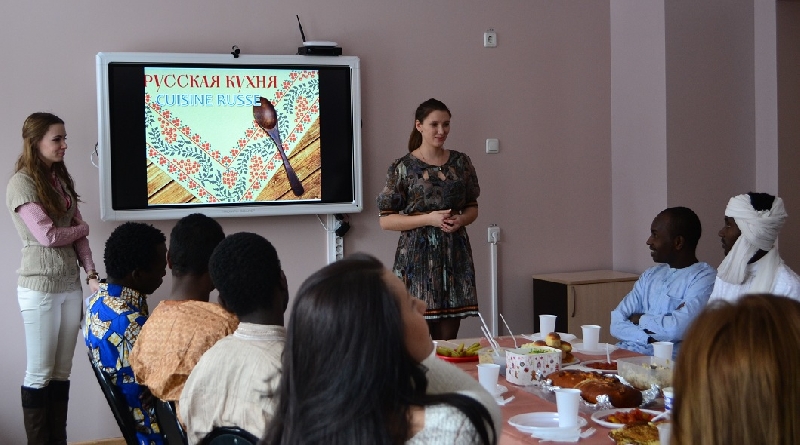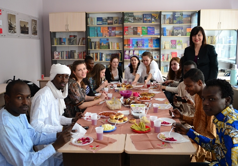 25 марта 2015 г. в рамках Недели иностранных языков, организованной кафедрой "Иностранные языки и методика преподавания иностранных языков", на базе ресурсного центра французского языка (11-481), в лучших русских традициях состоялась встреча студентов из Республики Чад и студентов ИФФ направления "Иностранные языки". Студенты 5 курса французского отделения познакомили своих иностранных гостей с традициями русской кухни и провели увлекательный кулинарный мастер-класс, сопровождаемый дегустацией исконно русских блюд. Интересной стала беседа о культурных традициях России и Чада, стран очень разных и, как оказалось, очень похожих. Интерактивное общение и виртуальное путешествие по России и Чаду, которые стали возможны благодаря мультимедийному оснащению ресурсного центра французского языка, позволили создать атмосферу взаимозаинтересованнаости и согласия. Иностранные студенты, в свою очередь, продемонстрировали великолепные национальные костюмы, что придало особый колорит этой незабываемой встрече. Ресурсный центр французского языка становится настоящим культурным центром для тех, кого объединяет французский язык и желание общаться!