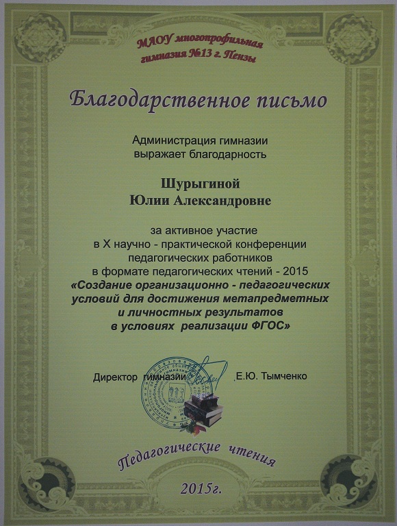 Преподаватель кафедры «Иностранные языки и методика преподавания иностранных языков» Шурыгина Ю.А. приняла участие в работе секции «Перспективы введения ФГОС ООО» в качестве эксперта. За активное участие в Педагогических чтениях администрацией гимназии было вручено благодарственное письмо.