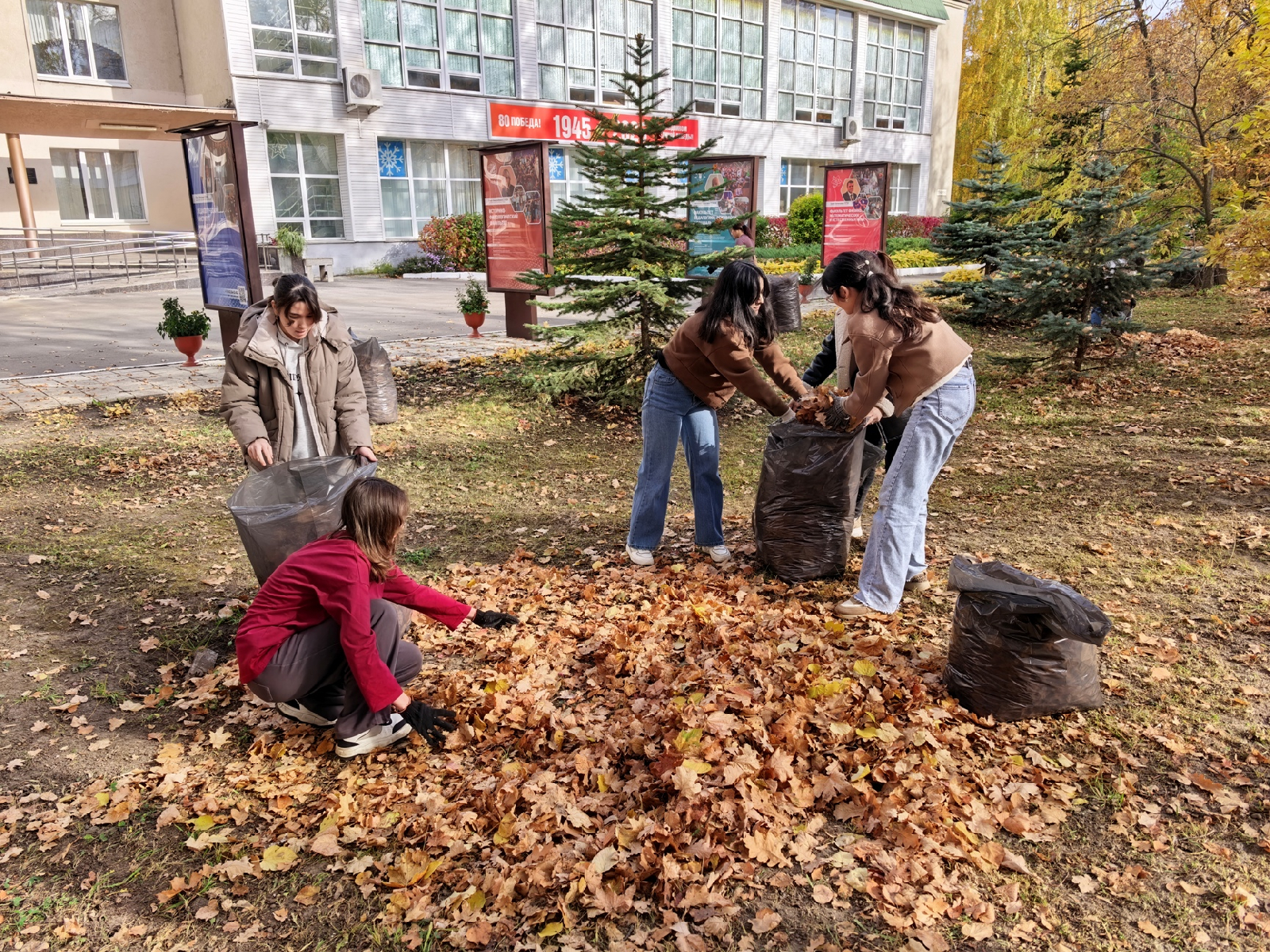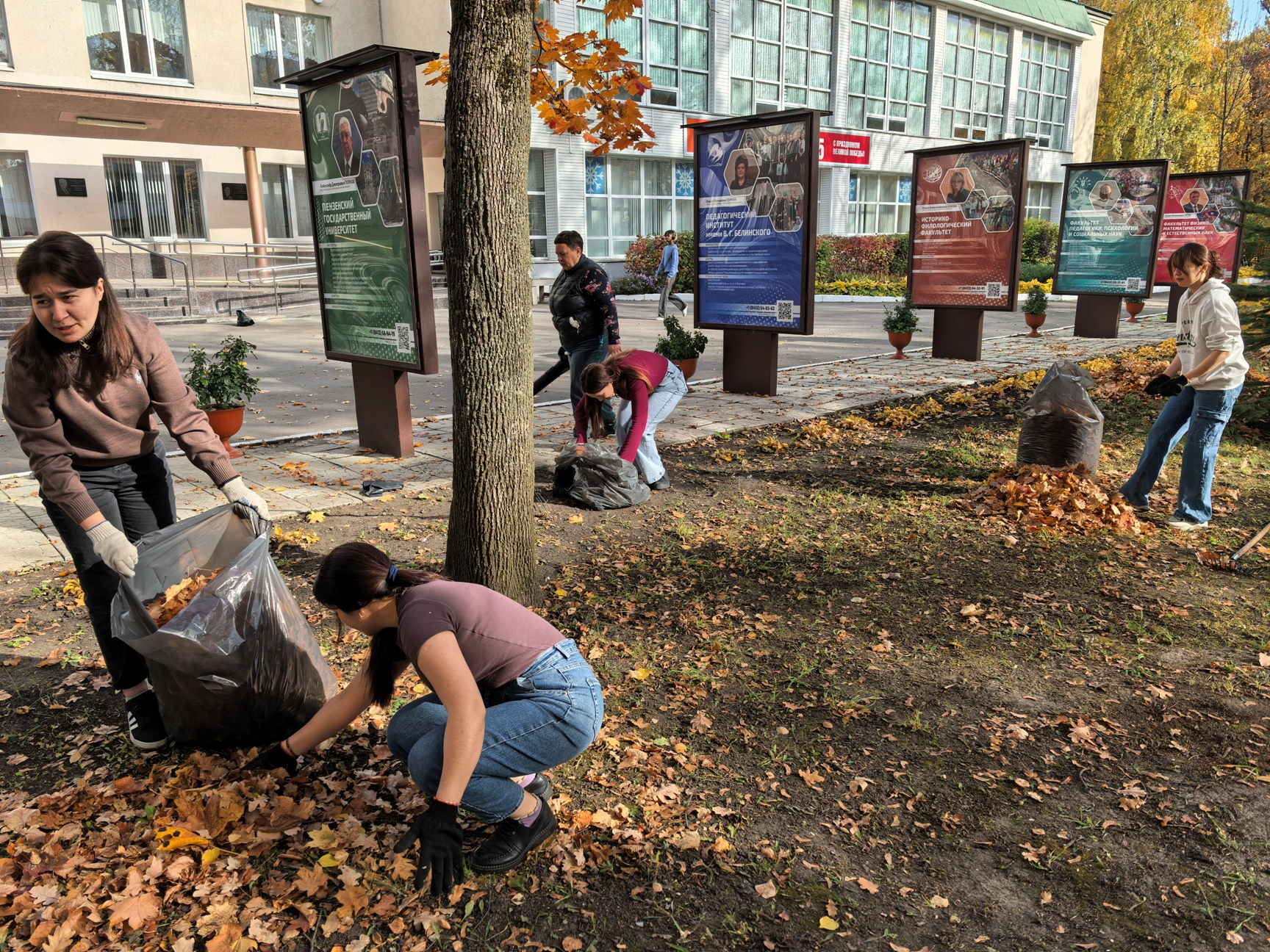 Однако под руководством опытных кураторов (Дмитриев Д.В. и Потылицина И.Г.) студенты смогли прийти к единству: договорились собирать листья небольшими равномерными кучками и заполнять ими специально подготовленные пакеты. Спустя некоторое время напряжённая работа была вознаграждена результатом: вся территория сияла чистотой.